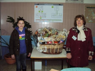 Como vem sendo hábito, a biblioteca escolar da EBI/JI de Santa Catarina promoveu mais um Cabaz de Natal. O objectivo desta iniciativa é angariar fundos que se destinam a enriquecer o seu espólio. A Inês Gomes do 6º B, vendeu as rifas e a  feliz contemplada foi a D. Rosa Frias do Casal do Giro – Antas.